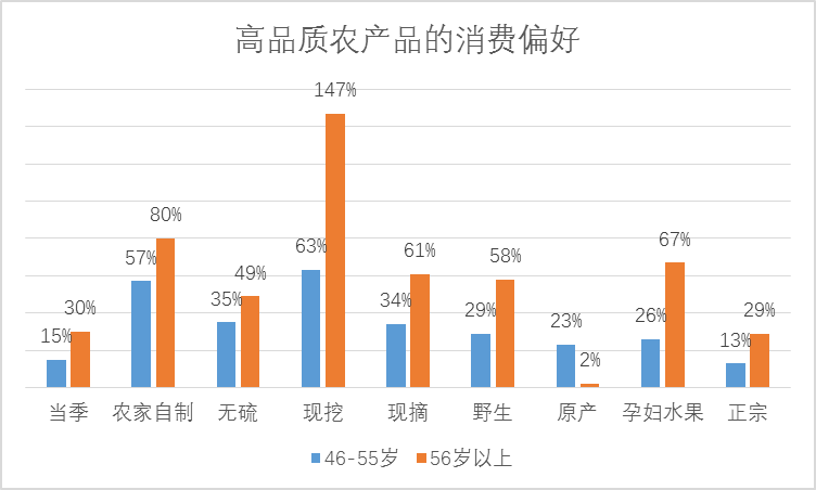 46歲以上消費者對農產品的品質特征更為關注。他們更愛買現挖現摘、農家自制、野生的農產品,對天然、高品質的孕婦水果消費偏好也高于其他消費人群。