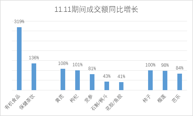 近幾年,全國各地的農產品開始登上京東11.11的舞臺。有機食品成交額同比增長319%,保健茶飲增長136%。隨著人們養生觀念的不斷增強,傳統滋補品比往年熱銷,黃芪、枸杞成交額同比增長超過100%。水果品類中,應季的柿子成交額同比增長100%,榴蓮、芭樂增長超過80%。