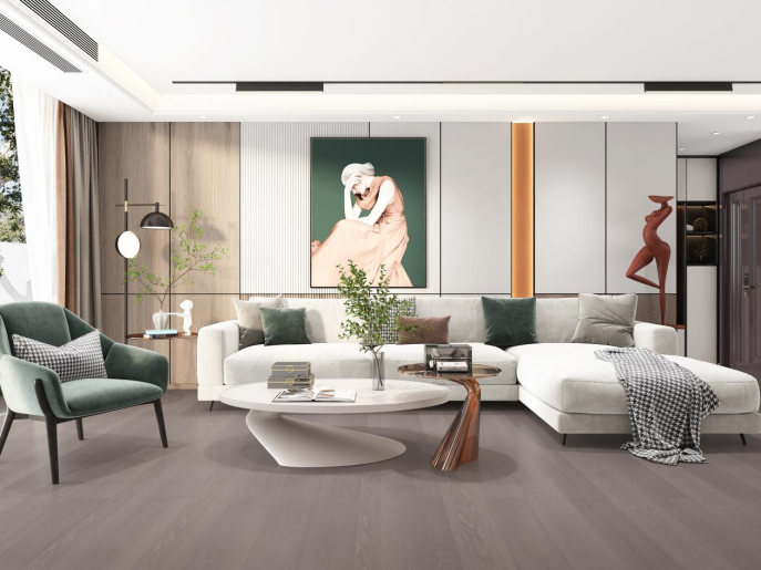 溫潤細膩的微光面層,比啞光面層更具色彩流動感,比亮光地板更雅致,有效提升空間高級質感。