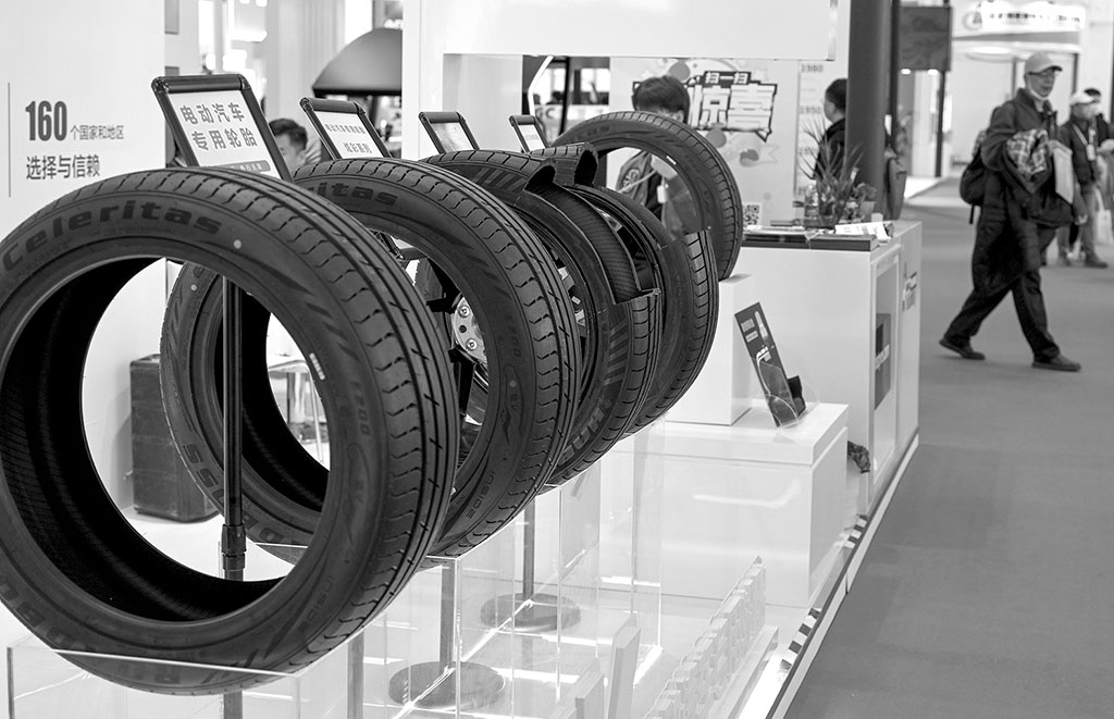 圖為在智能汽車鏈展區,一家企業展臺展示的電動汽車專用輪胎。李 賀 攝