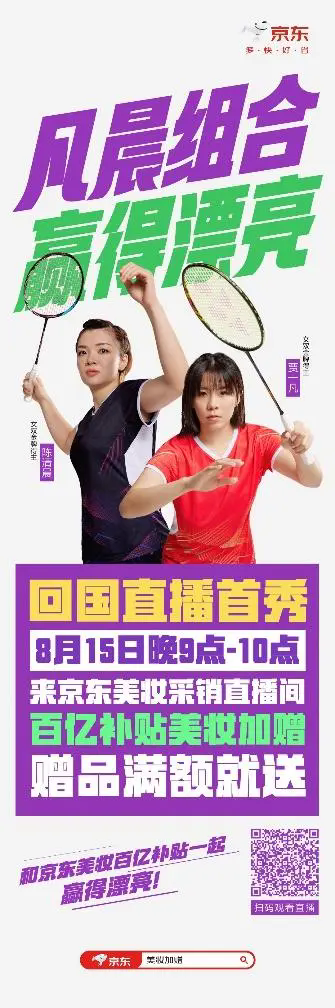 8月15日晚上9點,京東特別邀請到了2024年巴黎奧運會羽毛球女子雙打冠軍“凡晨組合”陳清晨、賈一凡,來到京東美妝采銷直播間,除了將分享兩人在奧運賽場上的奪金心路歷程,回應(yīng)近期圍繞她們的熱點話題,還將為大家分享自己參加比賽時化妝的技巧,解答粉絲們的“十萬個為什么”。