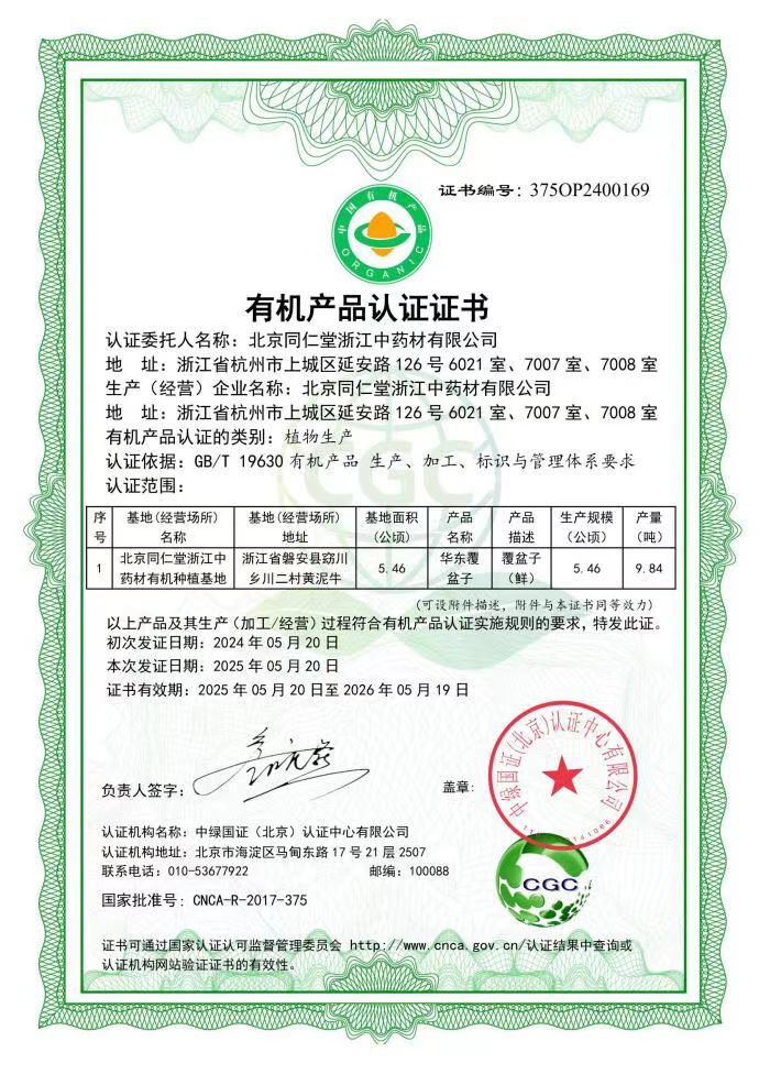 同仁堂科技浙江種植基地中藥材覆盆子通過有機認證