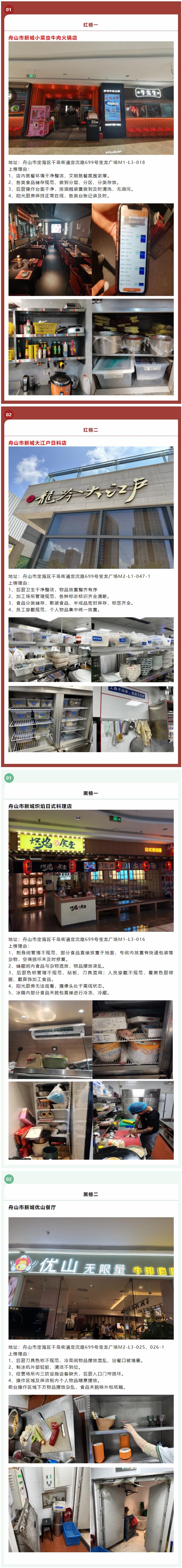 打造“浙里食安”,平安護航亞運。日前,浙江省舟山市新城市場監管分局持續對轄區陽光街區內餐飲店開展“紅黑榜”評價檢查,本期評比對象為寶龍廣場陽光綜合體內餐飲店。評價內容涉及兩個責任、食品安全、陽光廚房、外賣封簽、文明就餐、反食品浪費、人員健康管理、場所環境衛生、食品采購貯存、后廚加工制作、餐飲具清洗消毒、“三防”設施配備、餐廚廢棄物處理等。