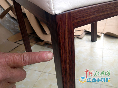 11日上午,記者來到萬女士家,看到了她買的那套家具。由于餐椅腳被噴上了和實木一樣顏色的涂料,乍一看根本判斷不了材質。不過,當記者同時撫摸餐椅腳和實木做的餐桌腳時,發現餐椅腳明顯涼很多,此外,輕輕敲擊也會出現不同的聲音。