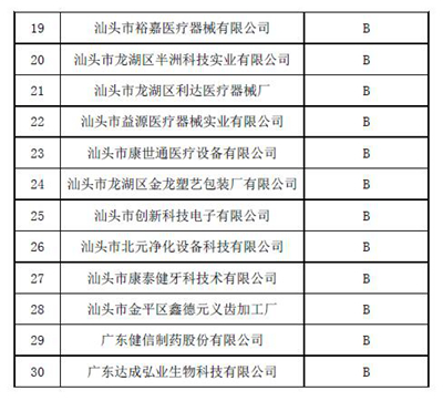 ??? 中國質(zhì)量新聞網(wǎng)訊 2018年1月10日,汕頭市食藥監(jiān)局官網(wǎng)公布汕頭市2017年度醫(yī)療器械生產(chǎn)企業(yè)質(zhì)量信用評級名單。