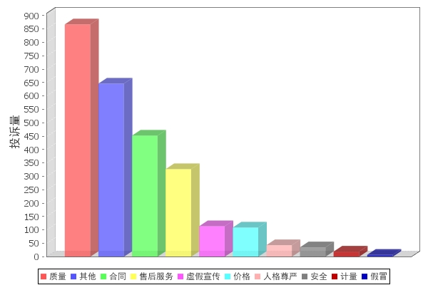 ?????根據(jù)云南省消協(xié)組織受理投訴情況統(tǒng)計,2018年三季度云南省消協(xié)組織共受理消費者投訴2619件,解決2418件,投訴解決率92.3%,為消費者挽回經(jīng)濟損失751.63萬元。三季度接待消費者來訪和咨詢7801人次。 ??? (一)投訴性質(zhì)分析 根據(jù)投訴性質(zhì)分析(如圖一所示),質(zhì)量867件,占33.10%;其他646件,占24.67%;合同452件,占17.26%;售后服務(wù)327件,占12.49%;虛假宣傳114件,占4.35%;價格109件,占4.16%;人格尊嚴43件,占1.64%;安全35件,占1.34%;計量19件,占0.73%;假冒7件,占0.27%;其中,質(zhì)量、其他、合同、售后服務(wù)、虛假宣傳占據(jù)了消費者投訴的前5名。