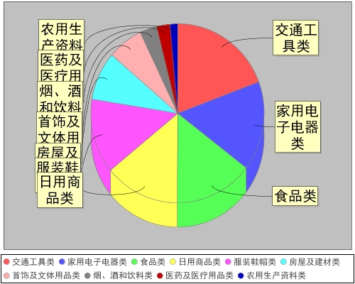 表1?按投訴問題性質(zhì)分類情況表 ???(二)商品投訴分析 ?根據(jù)商品投訴分析(如圖二所示),交通工具類279件,占10.65%;家用電子電器類233件,占8.90%;食品類212件,占8.09%;日用商品類203件,占7.75%;服裝鞋帽類195件,占7.45%;房屋及建材類127件,占4.85%;首飾及文體用品類96件,占3.67%;煙、酒和飲料類46件,占1.76%;醫(yī)藥及醫(yī)療用品類36件,占1.37%;農(nóng)用生產(chǎn)資料類20件,占0.76%;其中,交通工具類、家用電子電器類、食品類、日用商品類、服裝鞋帽類占據(jù)了消費者投訴的前5名。