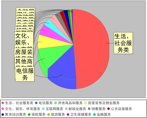 表2:按投訴商品類別性質(zhì)分類情況表 (三)服務(wù)投訴分析 ?根據(jù)服務(wù)投訴分析(如圖三所示),生活、社會服務(wù)類571件,占21.80%;電信服務(wù)165件,占6.30%;其他商品和服務(wù)120件,占4.58%;房屋裝修及物業(yè)服務(wù)77件,占2.94%;文化、娛樂、體育服務(wù)59件,占2.25%;互聯(lián)網(wǎng)服務(wù)39件,占1.49%;郵政業(yè)服務(wù)38件,占1.45%;銷售服務(wù)28件,占1.07%;公共設(shè)施服務(wù)22件,占0.84%;教育培訓服務(wù)21件,占0.80%;保險服務(wù)11件,占0.42%;旅游服務(wù)10件,占0.38%;衛(wèi)生保健服務(wù)7件,占0.27%;金融服務(wù)4件,占0.15%;其中,生活、社會服務(wù)類、電信服務(wù)、其他商品和服務(wù)、房屋裝修及物業(yè)服務(wù)、文化、娛樂、體育服務(wù)占據(jù)了消費者投訴的前5名。
