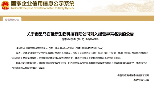 中國質量新聞網訊? 近日,從國家企業信用信息公示系統獲悉,秦皇島市海港區市場監督管理局發布關于秦皇島百佳康生物科技有限公司列入經營異常名錄的公告(海市監企異字【2019】JB函18002號)。