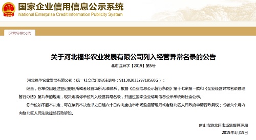 中國質量新聞網訊 近日,從國家企業信用信息公示系統獲悉,唐山市路北區市場監督管理局發布關于河北福華農業發展有限公司列入經營異常名錄的公告(北市監異字【2019】第5號)。