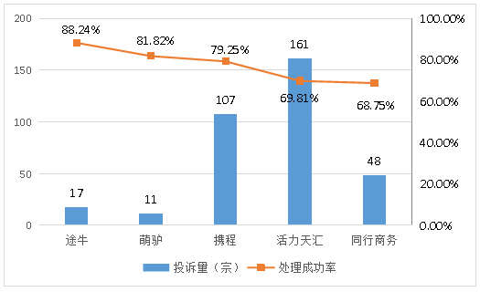 ? ? ? ?投訴處理成功率排名前五的是:北京途牛國際旅行社有限公司深圳分公司(投訴量17宗,處理成功率88.24%);深圳市萌驢旅游集團有限公司(投訴量11宗,處理成功率81.82%);深圳攜程國際旅行社有限公司(投訴量107宗,處理成功率79.25%);深圳市活力天匯科技股份有限公司(投訴量161宗,處理成功率69.81%);深圳市同行商務服務有限公司(投訴量48宗,處理成功率68.75%)。