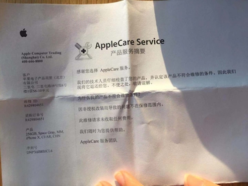 “經(jīng)過初步檢測、還原設(shè)備、重裝系統(tǒng)等步驟,依然存在問題,遂選擇返場修理。”劉先生告訴中國質(zhì)量新聞網(wǎng)。2019年9月25日,蘋果直營店工作人員告訴劉先生,“我們的技術(shù)人員仔細檢查了您的產(chǎn)品,并認定該產(chǎn)品不符合維修條件,原因是手機出現(xiàn)‘非授權(quán)改裝’,因此而導(dǎo)致的問題不在保修范圍內(nèi)。”