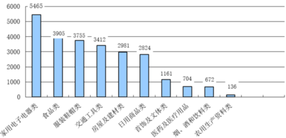 按商品種類來分,涉及家用電子電器、食品、服裝鞋帽類的消費者投訴居前三位(見圖2)。