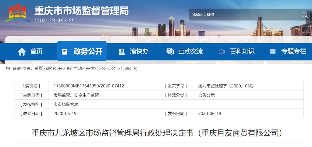 中國質量新聞網訊 2020年6月19日,重慶市市場監督管理局網站發布重慶市九龍坡區市場監督管理局行政處理決定書(重慶月友商貿有限公司)。