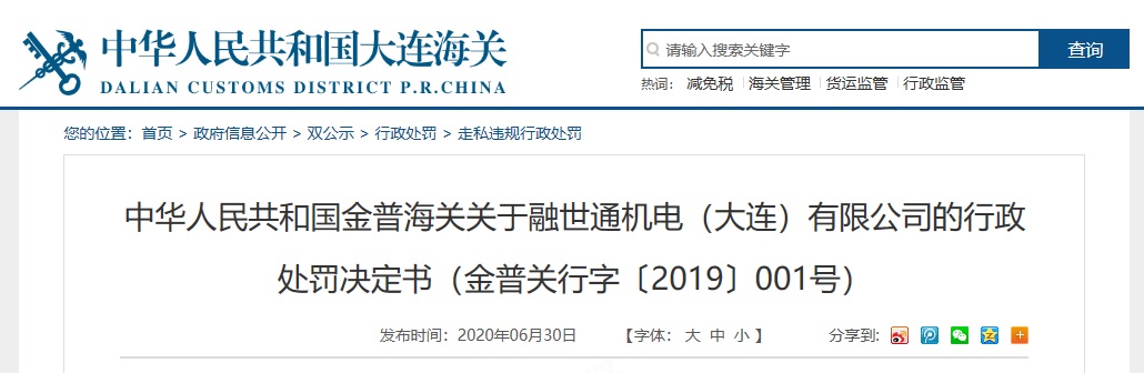 中國質量新聞網訊 2020年6月30日,大連海關網站發布《中華人民共和國金普海關關于融世通機電(大連)有限公司的行政處罰決定書(金普關行字〔2019〕001號)》。