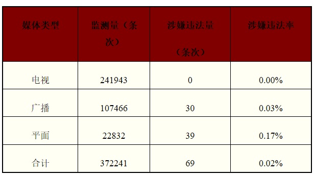 2020年6月1日至2020年6月30日,全市共監測電視、廣播、平面等傳統媒體廣告372241條次,發現涉嫌違法廣告69條次,涉嫌違法率0.02%。