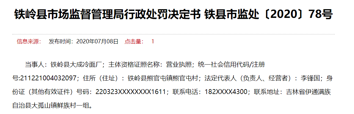 當事人:鐵嶺縣大成冷面廠;主體資格證照名稱:營業執照;統一社會信用代碼/注冊號:211221004032097;住所(住址):鐵嶺縣熊官屯鎮熊官屯村;法定代表人(負責人、經營者):李鋒國;身份證(其他有效證件)號碼:220323XXXXXXXX1611;聯系電話:182XXXX4300;聯系地址:吉林省伊通滿族自治縣大孤山鎮鮮族村一組。