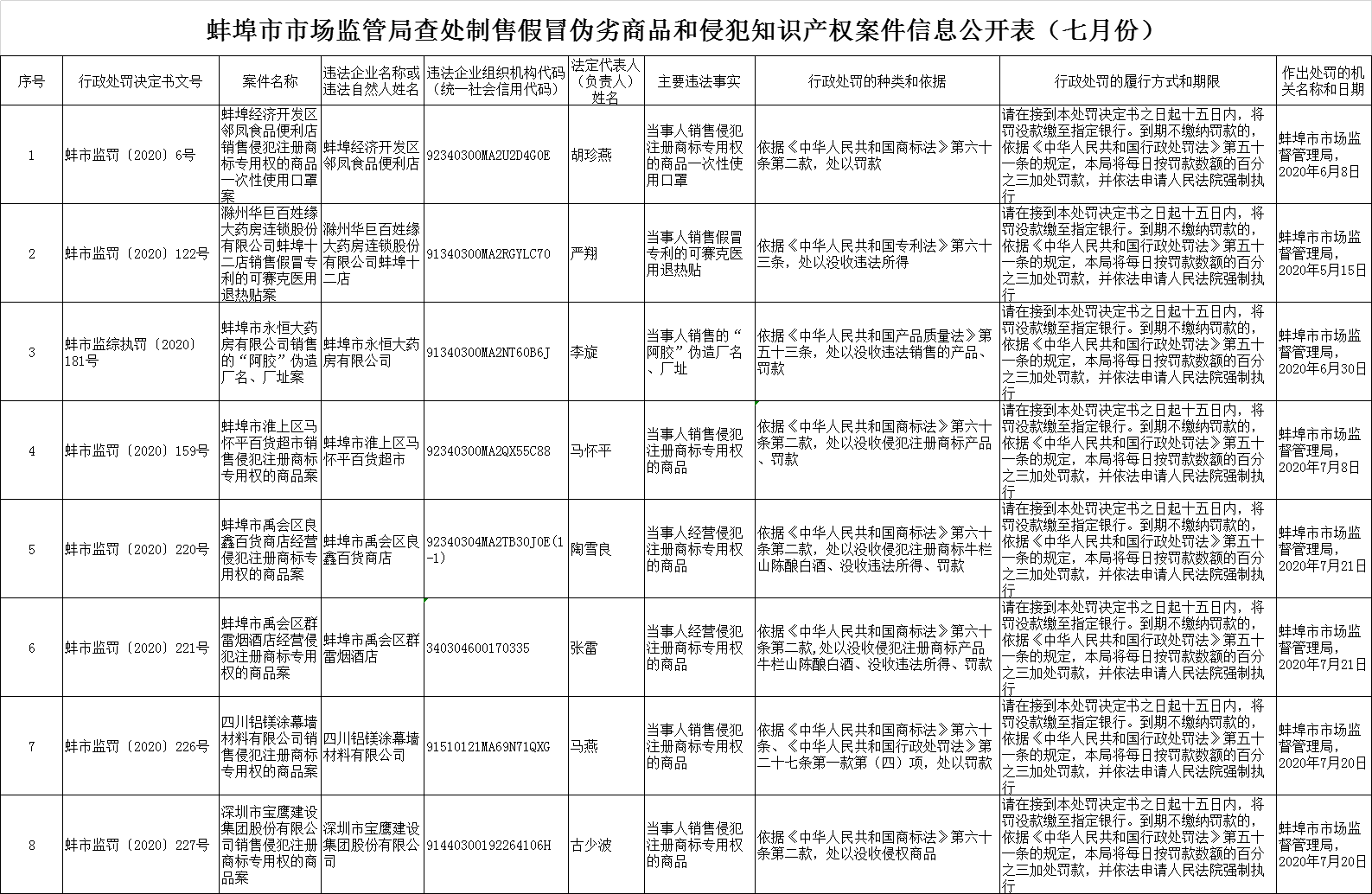 中國質量新聞網訊 近日,安徽蚌埠市市場監管局查處制售假冒偽劣商品和侵犯知識產權案件信息公開表(七月份)發布。
