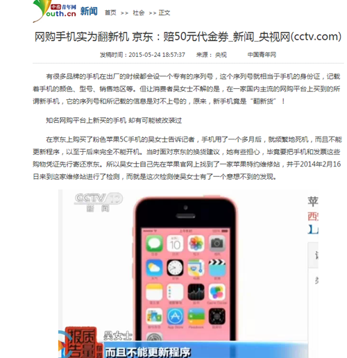 中國質(zhì)量新聞網(wǎng)調(diào)查發(fā)現(xiàn),對(duì)于在京東買到疑似“翻新機(jī)”產(chǎn)品的案例不是個(gè)別現(xiàn)象,早在2015年,央視《每周質(zhì)量報(bào)告》就曾在報(bào)道中稱在京東上銷售翻新蘋果手機(jī)。此事在社會(huì)上鬧得沸沸揚(yáng)揚(yáng),在當(dāng)時(shí),京東方面對(duì)外稱,他們銷售的蘋果手機(jī)是得到了蘋果公司授權(quán)的,而且貨物都是蘋果公司給的,是正品行貨。蘋果公司官方給出的答復(fù)卻截然相反,其客服人員表示,京東并沒有獲得蘋果的授權(quán),可能第一手渠道是從廠家拿出來的,但是有可能中間轉(zhuǎn)了幾手之后再賣到客戶手中,大部分都是中間這個(gè)環(huán)節(jié)出現(xiàn)了問題。另有媒體報(bào)道稱,當(dāng)時(shí)投訴的一位消費(fèi)者購買的某款手機(jī)共銷售了9萬多部,其中3000多位消費(fèi)者給予了差評(píng),有639位消費(fèi)者直接質(zhì)疑其在京東購得的是翻新機(jī)。