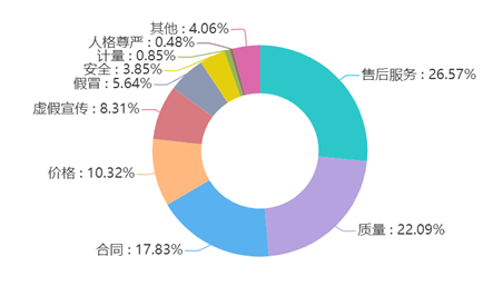在4336件服務類投訴中,生活社會服務類投訴最多,其次是網絡服務投訴、教育培訓服務、文化娛樂體育服務和房屋裝修及物業服務類投訴。其中,生活社會服務類投訴1131件,占服務類投訴的26.08%;網絡服務類投訴1021件,占服務類投訴的23.55%;教育培訓服務投訴684件,占服務類投訴的15.77%;文化娛樂體育服務類投訴627件,占服務類投訴的14.46%;房屋裝修及物業服務投訴209件,占服務類投訴的4.82%。