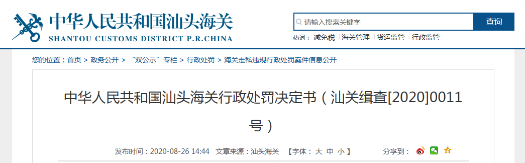 中國質量新聞網訊 近日,汕頭海關網站發布行政處罰決定書(汕關緝查[2020]0011號),涉及目色眼鏡(廣東)有限公司。