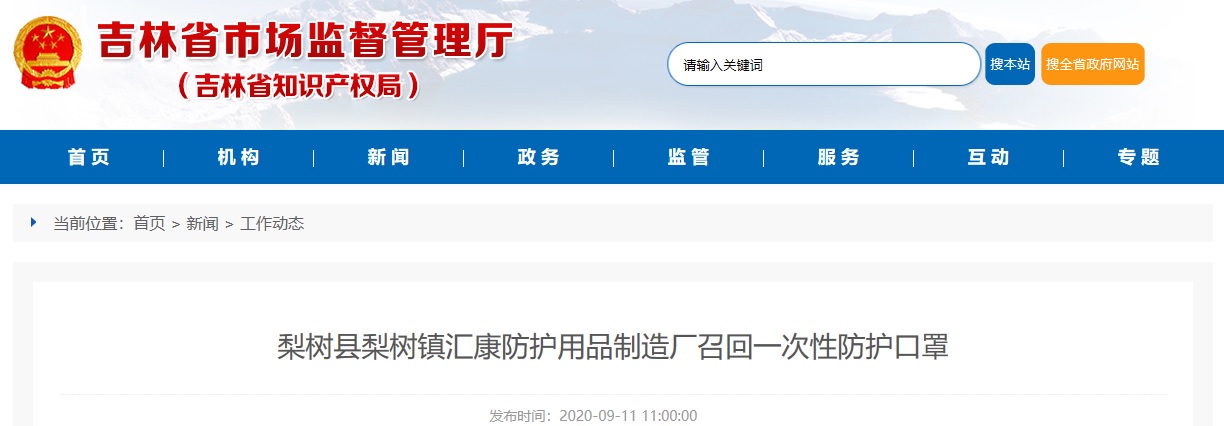 中國質量新聞網訊 據吉林省市場監督管理廳網站9月11日消息,日前,梨樹縣梨樹鎮匯康防護用品制造廠按照《消費品召回管理暫行規定》的要求,主動向吉林省市場監督管理廳報告了召回計劃,將自即日起,召回2020年3月13日至2020年3月14日生產的批號為:20200313型號為40片/盒的一次性防護口罩,涉及數量為80片。