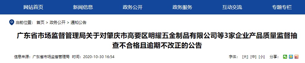 中國質(zhì)量新聞網(wǎng)訊 2020年10月30日,廣東省市場監(jiān)督管理局網(wǎng)站公告肇慶市高要區(qū)明耀五金制品有限公司等3家企業(yè)產(chǎn)品質(zhì)量監(jiān)督抽查不合格且逾期不改正的情況。