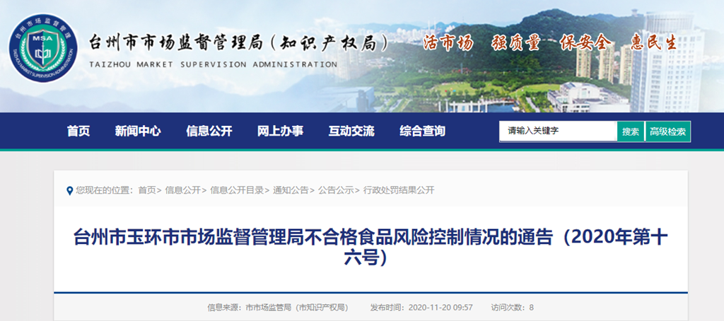 臺州市玉環市市場監督管理局不合格食品風險控制情況的通告(2020年第十六號)