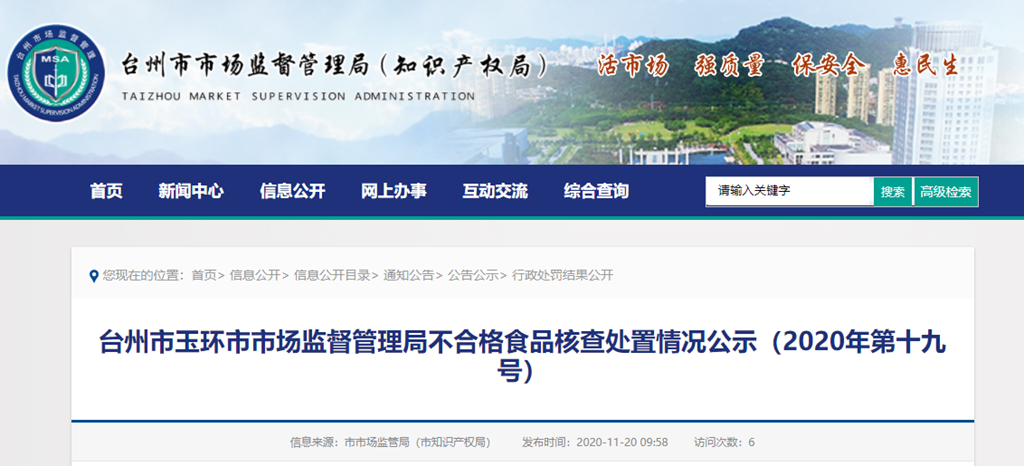 臺州市玉環市市場監督管理局不合格食品核查處置情況公示(2020年第十九號)