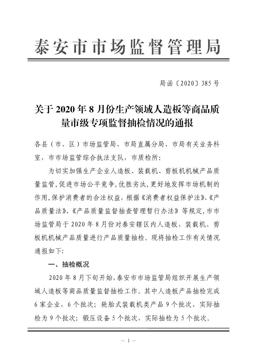 關于2020年8月份生產領域人造板等商品質量市級專項監督抽檢情況的通報