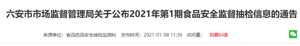 六安市市場監督管理局關于公布2021年第1期食品安全監督抽檢信息的通告