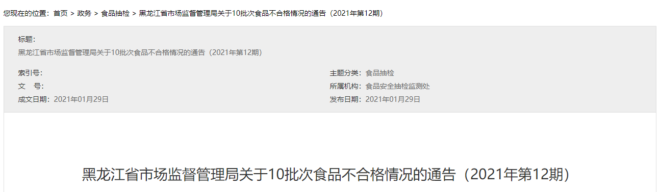 中國質(zhì)量新聞網(wǎng)訊 (記者 徐遠官) 2021年1月29日,黑龍江省市場監(jiān)督管理局網(wǎng)站發(fā)布關(guān)于10批次食品不合格情況的通告(2021年第12期)。通告稱,近期,該局組織完成了食品安全監(jiān)督抽檢任務(wù)153批次,涉及食用農(nóng)產(chǎn)品、糧食加工品、乳制品等4類食品。根據(jù)食品安全國家標準檢驗和判定,其中合格樣品143批次,不合格樣品10批次。不合格項目主要是獸藥殘留、檢出非食用物質(zhì)、食品添加劑超限量使用、微生物污染。具體情況如下: