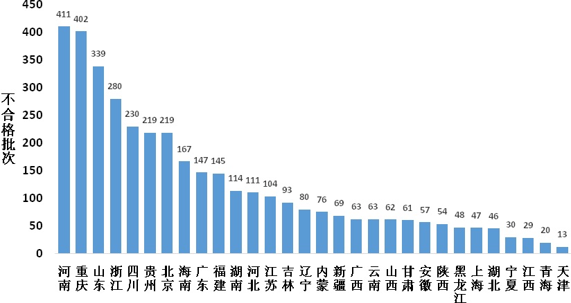 圖3 各省市場銷售食用農產品抽檢不合格數量分布