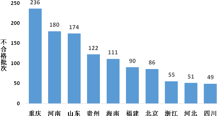 重慶市、河南省、山東省為蔬菜產品抽檢不合格最多的銷售地。重慶市抽檢不合格236批次,其中韭菜70批次、芹菜39批次;河南省抽檢不合格180批次,其中韭菜82批次、豆芽47批次;山東省抽檢不合格174批次,其中韭菜72批次、豆芽52批次(詳見圖6)。