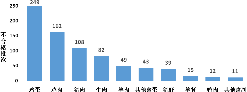 雞蛋、雞肉、豬肉等畜禽產品獸藥殘留批次最多。249批次雞蛋檢出獸藥殘留超標,其中氟苯尼考、恩諾沙星殘留超標批次最多;162批次雞肉檢出獸藥殘留超標,其中恩諾沙星、磺胺類殘留超標批次最多;108批次豬肉檢出獸藥殘留超標,其中恩諾沙星、磺胺類殘留超標批次最多(詳見圖8)。