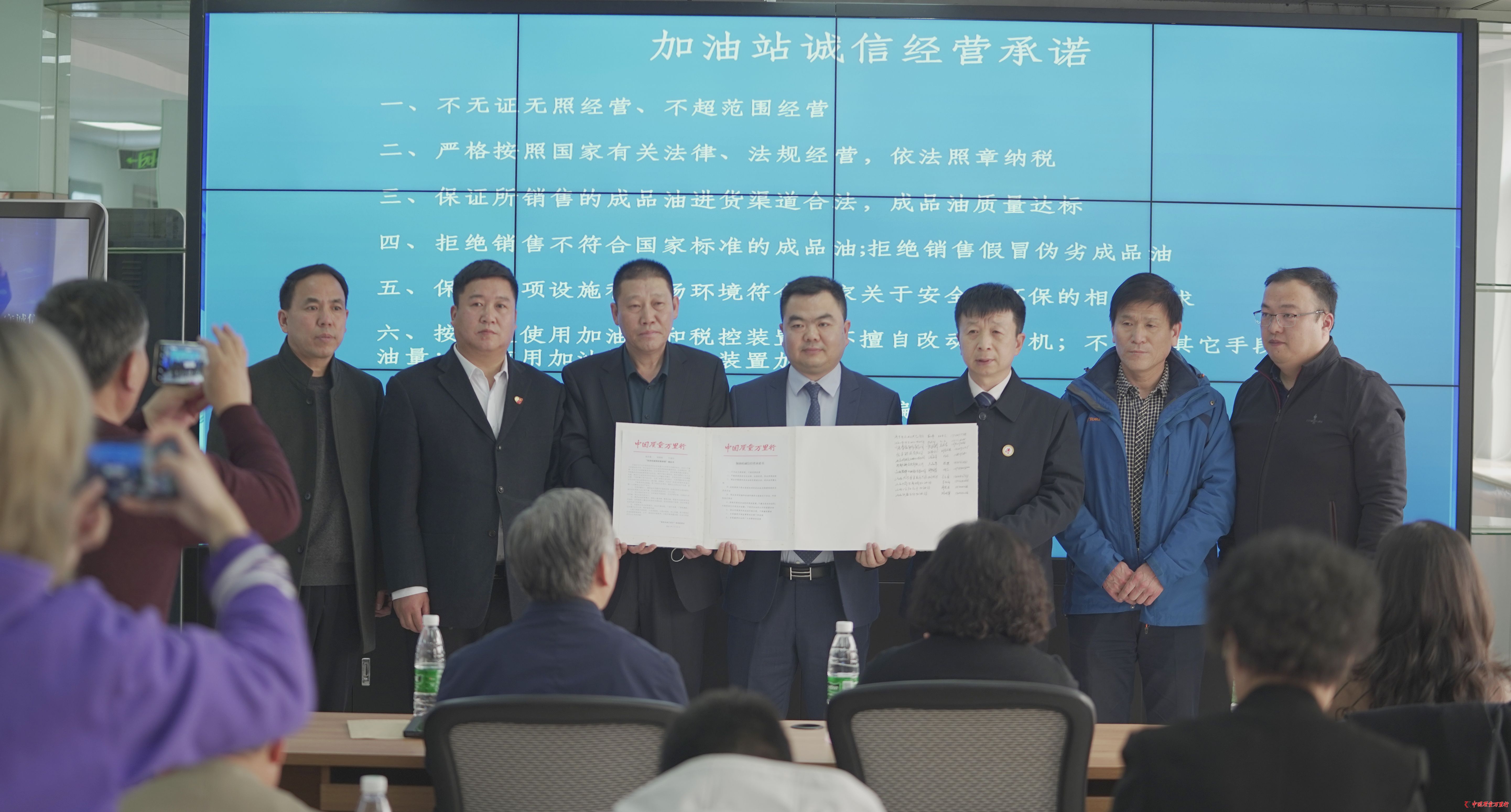 山東濟寧石油天然氣商會、張家口聯合石化有限公司、寧夏泰富能源有限公司、悅孚石化有限公司、山西碧辟石油銷售有限公司、河南大橋石化集團、北京潤福通石油化工有限公司等7家成品油經銷企業負責人,作為加油站經營者代表簽署了承諾協議,發表了承諾宣言:嚴格落實安全措施,勇于承擔社會責任,確保企業安全生產運營,保障廣大消費者生命財產安全;堅持質量至上,確保油品質量符合國家標準、經營品種符合國家要求、油品進貨渠道合法正規可靠,堅決抵制假冒偽劣、以次充好;響應國家環保號召,自覺推進節能減排,完成防滲改造、完善油氣回收設施,保證設備完好運行;秉承誠信經營理念,確保計量準確、精度合格,配備符合國家要求的加油機,自覺接受計量檢定機構的定期檢測,堅決杜絕缺斤短兩,保證消費者合法權益不受侵害;牢固樹立依法納稅意識,依法足額納稅,不虛開發票、不偷稅漏稅,切實履行應盡義務,維護國家利益。