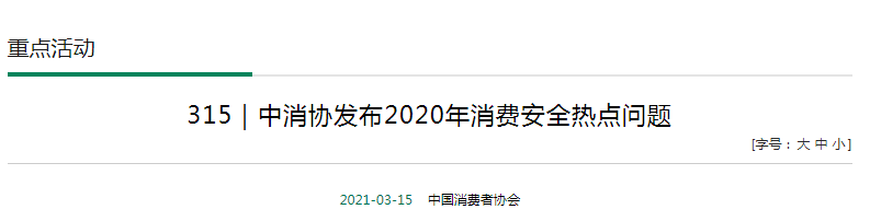 2021年3月15日,中消協發布2020年消費安全熱點問題,涉及餐飲浪費、預付費商家跑路、虛假宣傳和個人信息泄露等與消費者利益密切相關的行為和事件。