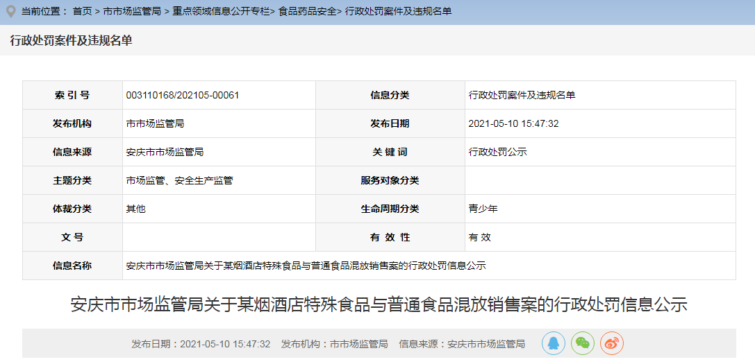 中國質量新聞網訊 2021年5月10日,安徽省安慶市市場監管局發布某煙酒店特殊食品與普通食品混放銷售案的行政處罰信息。具體如下: