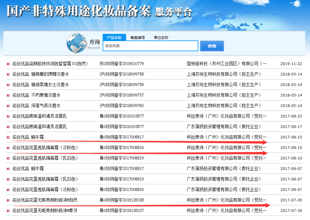以化妝品為例,中國(guó)質(zhì)量新聞網(wǎng)在國(guó)家藥監(jiān)局國(guó)產(chǎn)非特殊用途化妝品備案服務(wù)平臺(tái)搜索“名創(chuàng)優(yōu)品”,結(jié)果顯示,有多家公司登記在案,這意味著其產(chǎn)品是由多家代加工供應(yīng)商生產(chǎn)。
