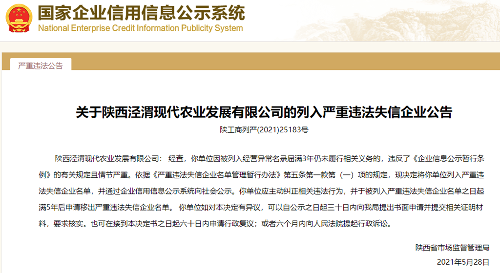 違反《企業(yè)信息公示暫行條例》規(guī)定,陜西涇渭現(xiàn)代農(nóng)業(yè)發(fā)展有限公司被列入嚴(yán)重違法失信企業(yè)名單