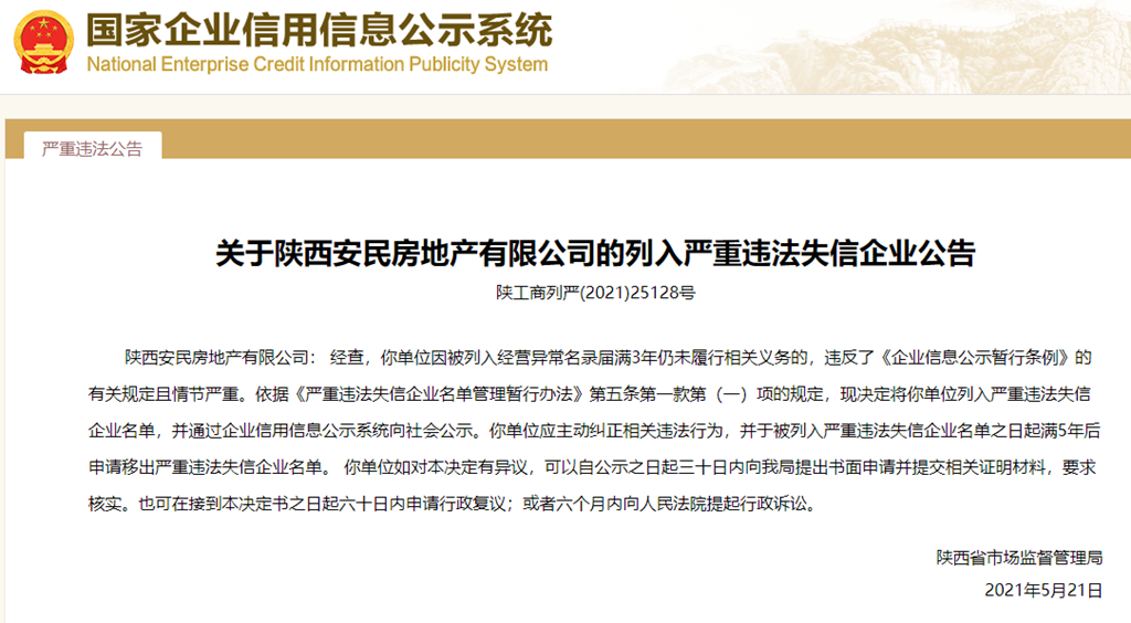 中國質量新聞網訊 從國家企業信用信息公示系統獲悉,2021年5月21日,陜西省市場監督管理局發布關于陜西安民房地產有限公司列入嚴重違法失信企業名單的公告(陜工商列嚴(2021)25128號)。