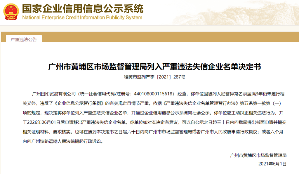 中國質量新聞網訊 從國家企業信用信息公示系統獲悉,2021年6月1日,廣州市黃埔區市場監督管理局發布關于廣州田印貿易有限公司列入嚴重違法失信企業名單決定書(穗黃市監列嚴字[2021]287號)。
