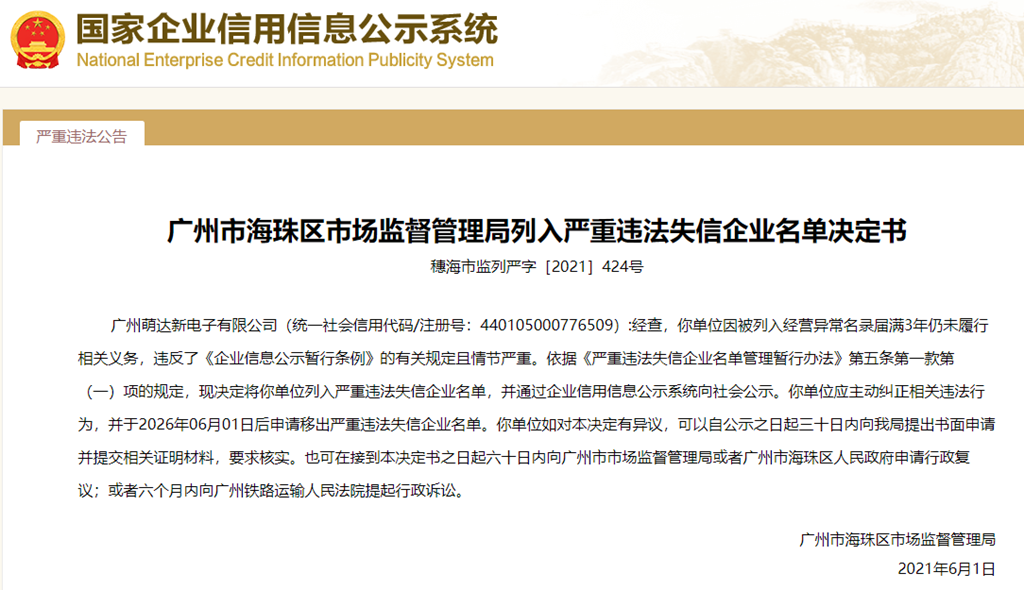 中國質(zhì)量新聞網(wǎng)訊 從國家企業(yè)信用信息公示系統(tǒng)獲悉,2021年6月1日,廣州市海珠區(qū)市場監(jiān)督管理局發(fā)布關(guān)于廣州萌達新電子有限公司列入嚴重違法失信企業(yè)名單決定書(穗海市監(jiān)列嚴字[2021]424號)。