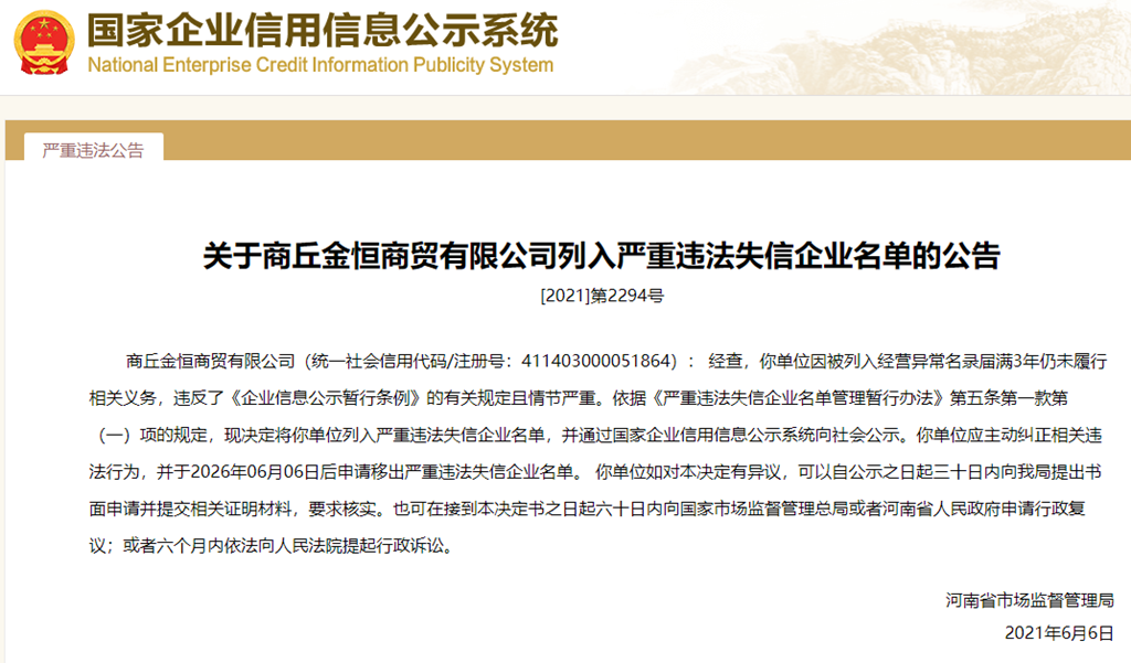 中國質量新聞網訊 從國家企業信用信息公示系統獲悉,2021年6月6日,河南省市場監督管理局發布關于商丘金恒商貿有限公司列入嚴重違法失信企業名單的公告([2021]第2294號)。