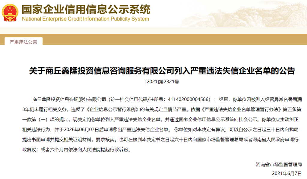 中國質量新聞網訊 從國家企業信用信息公示系統獲悉,2021年6月7日,河南省市場監督管理局發布關于商丘鑫隆投資信息咨詢服務有限公司列入嚴重違法失信企業名單的公告([2021]第2321號)。
