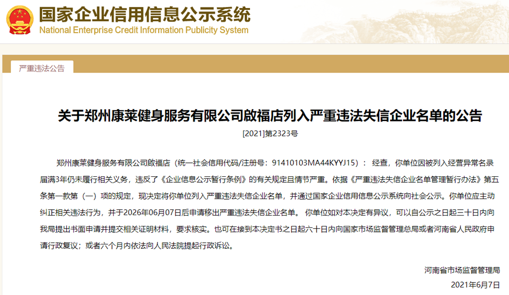 中國質(zhì)量新聞網(wǎng)訊 從國家企業(yè)信用信息公示系統(tǒng)獲悉,2021年6月7日,河南省市場(chǎng)監(jiān)督管理局發(fā)布關(guān)于鄭州康萊健身服務(wù)有限公司啟福店列入嚴(yán)重違法失信企業(yè)名單的公告([2021]第2323號(hào))。