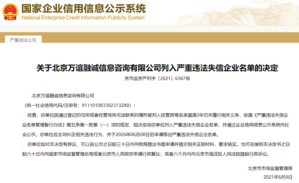 中國(guó)質(zhì)量新聞網(wǎng)訊 從國(guó)家企業(yè)信用信息公示系統(tǒng)獲悉,2021年6月8日,北京市市場(chǎng)監(jiān)督管理局發(fā)布關(guān)于北京萬(wàn)誼融誠(chéng)信息咨詢有限公司列入嚴(yán)重違法失信企業(yè)名單的決定(京市監(jiān)京嚴(yán)列字〔2021〕6367號(hào))。