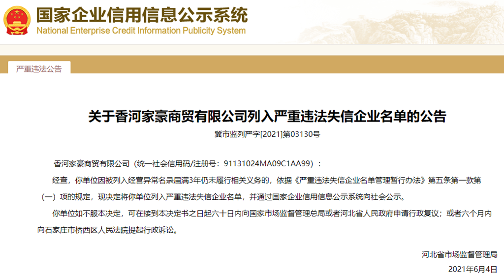 中國質(zhì)量新聞網(wǎng)訊 從國家企業(yè)信用信息公示系統(tǒng)獲悉,2021年6月4日,河北省市場監(jiān)督管理局發(fā)布關(guān)于香河家豪商貿(mào)有限公司列入嚴(yán)重違法失信企業(yè)名單的公告(冀市監(jiān)列嚴(yán)字[2021]第03130號)。