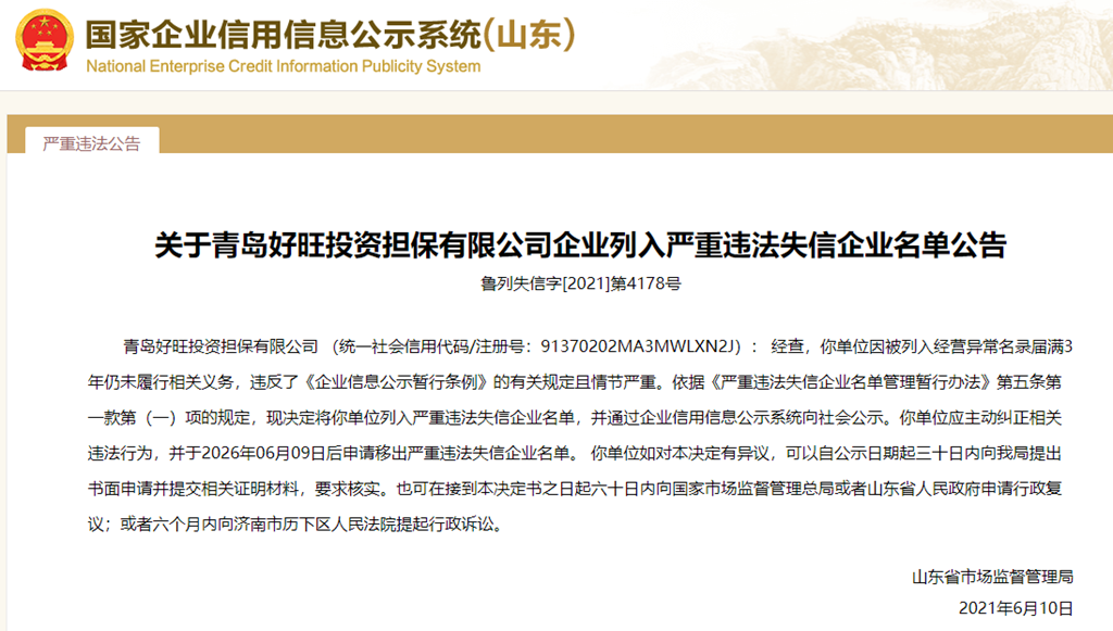 中國質量新聞網訊 從國家企業信用信息公示系統(山東)獲悉,2021年6月10日,山東省市場監督管理局發布關于青島好旺投資擔保有限公司企業列入嚴重違法失信企業名單的公告(魯列失信字[2021]第4178號)。