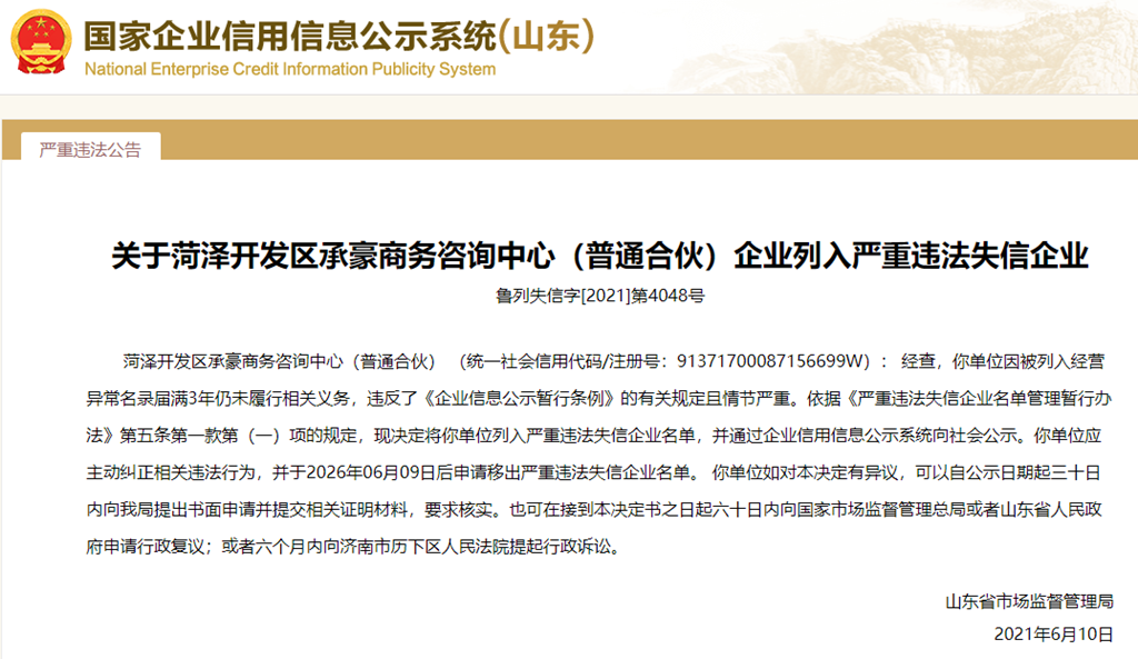 中國質(zhì)量新聞網(wǎng)訊 從國家企業(yè)信用信息公示系統(tǒng)(山東)獲悉,2021年6月10日,山東省市場監(jiān)督管理局發(fā)布關(guān)于菏澤開發(fā)區(qū)承豪商務(wù)咨詢中心(普通合伙)企業(yè)列入嚴(yán)重違法失信企業(yè)名單的公告(魯列失信字[2021]第4048號)。